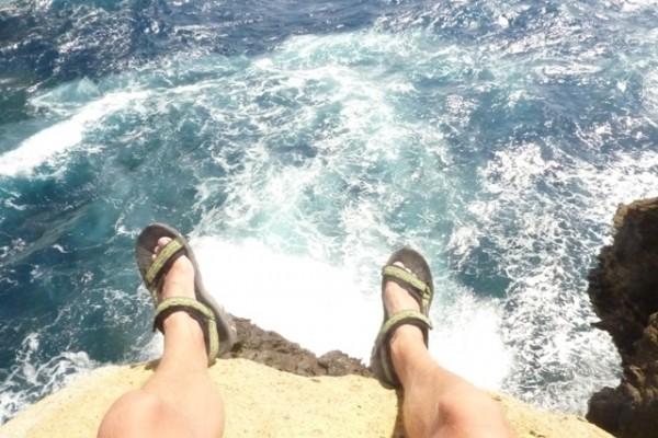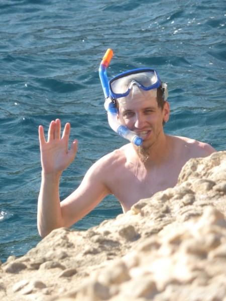 Tom šnorchluje kousek od jeskyně blue Grotto.